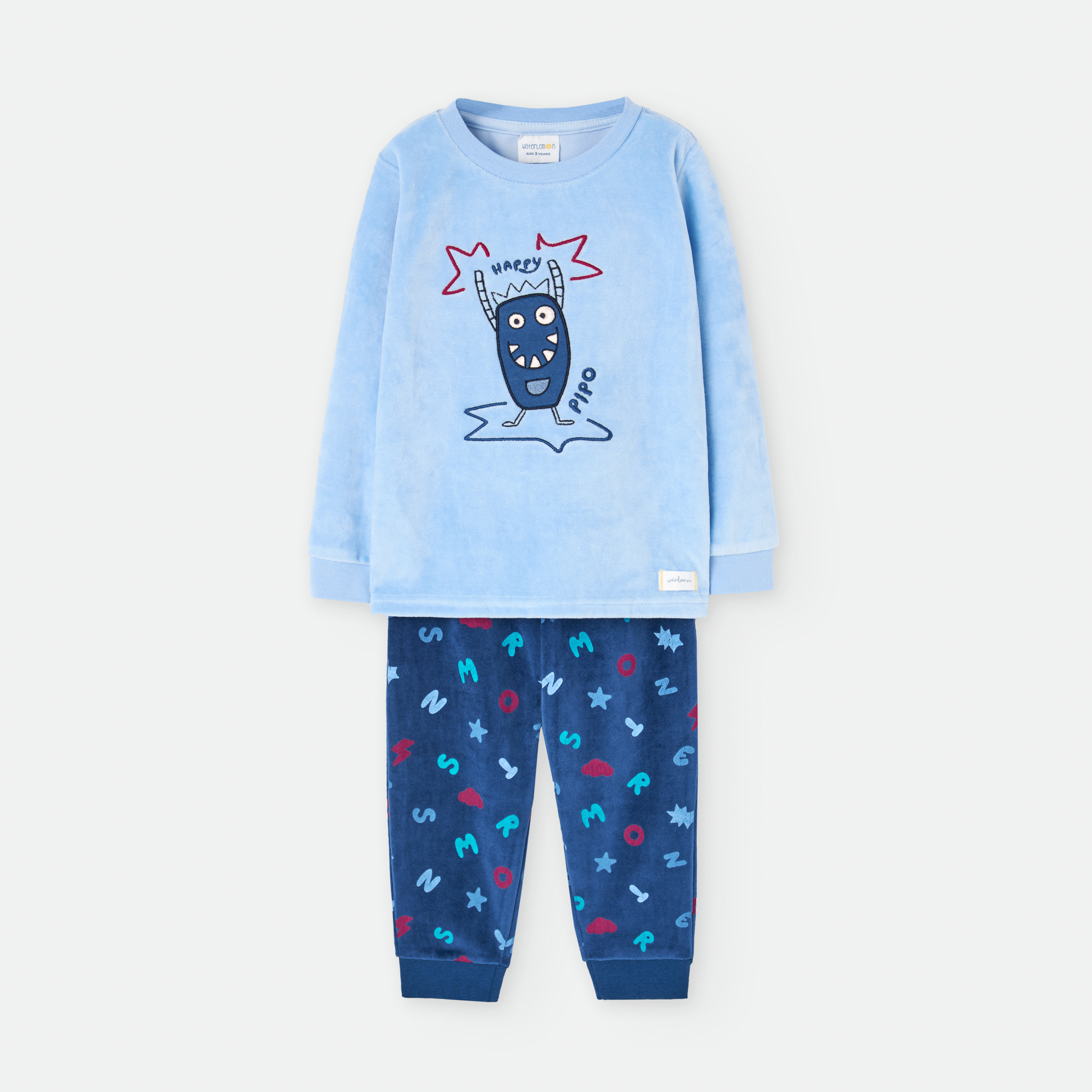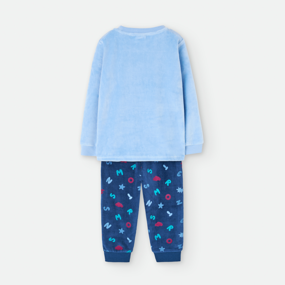 Pijama calentito de dos piezas, con tacto suave. Camiseta con cuello redondo y manga larga. Bordado en el delantero con un divertido monstruo. Pantalón largo con estampado integral de letras, cinturilla elástica y puño en el bajo.